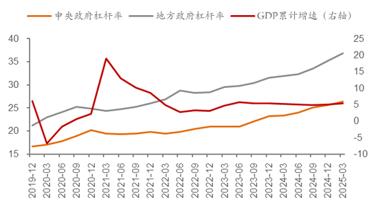 疫情以来中央、地方政府杠杆率均持续上升,分别从2019年末的16.7%、21.2%上升至2025年一季度末的26.4%、36.8%,说明地方政府的杠杆率水平上升更快,主要原因是近年来发行地方政府专项债券。